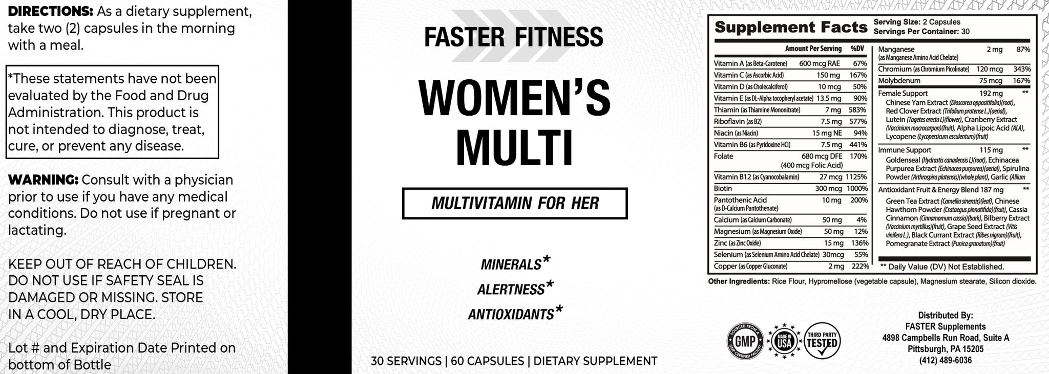 The Faster's Women's MultiVitamin contains a complete blend of the essential vitamins and minerals needed for good health.